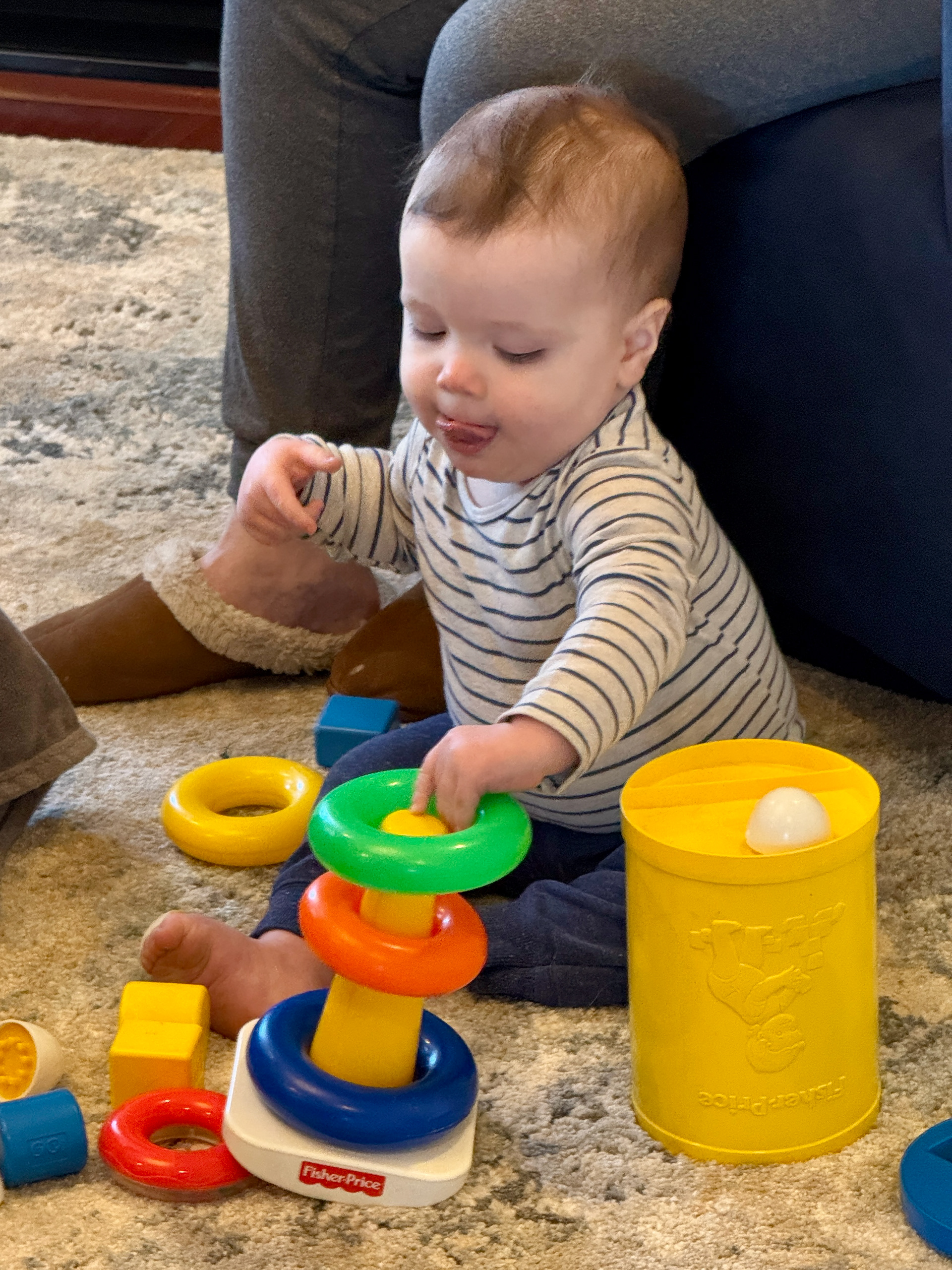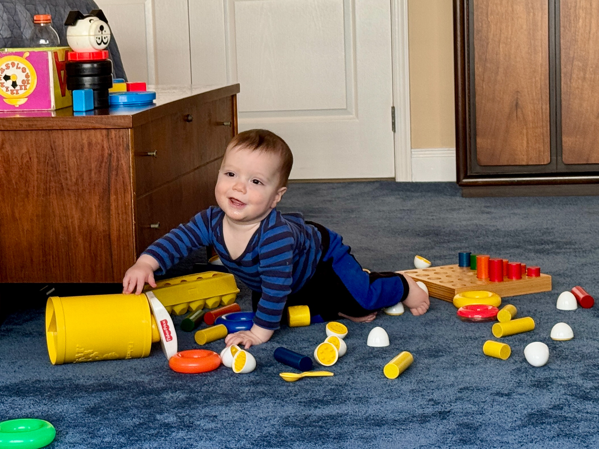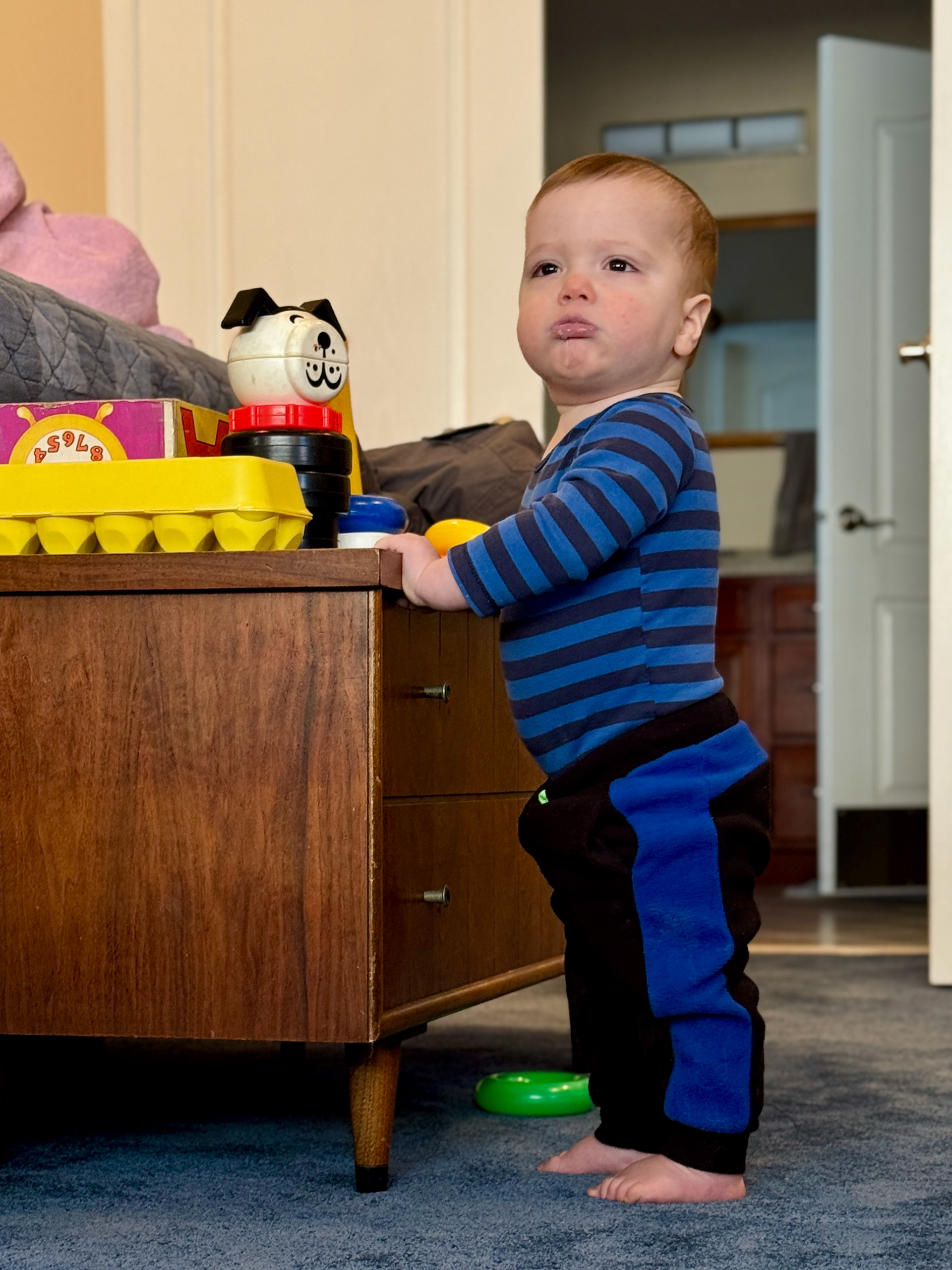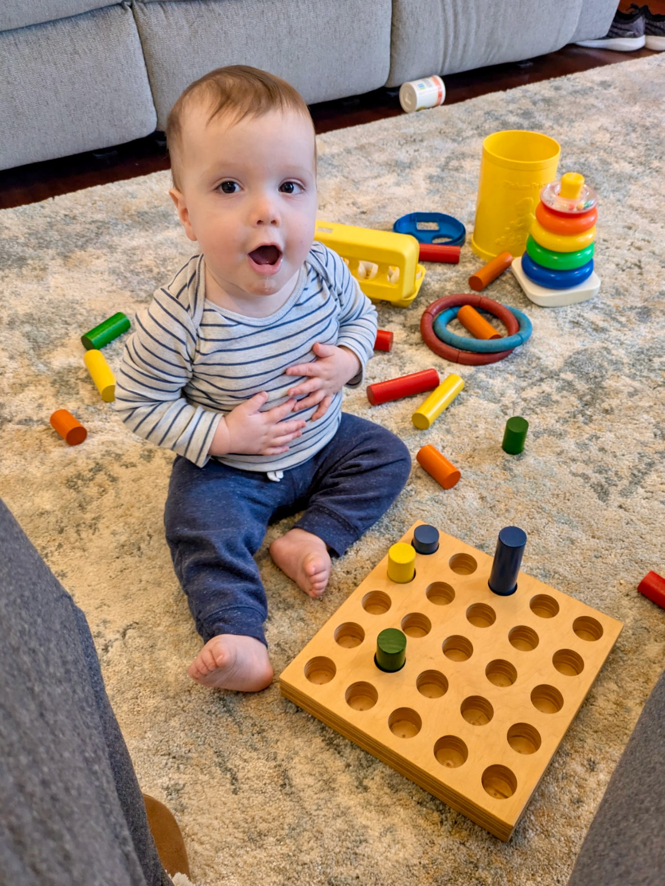 The background here is that J was playing with the old wooden pegs and dropped one down the back of his shirt!